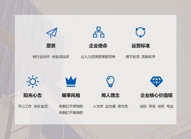 愿景:树行业标杆 ,创全球品牌 企业使命:让人力资源管理更简单 运营标准:细节反馈,落地有声 阳光心态:开心工作,快乐生活 做事风格:做我们不想做的,做我们不敢做的 用人理念:人为本、品为基、德为先 核心价值观:诚信、务实、创新、专业