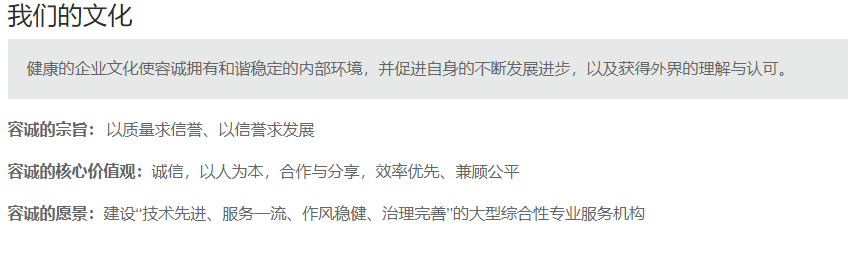 容诚的宗旨: 以质量求信誉、以信誉求发展 容诚的核心价值观:诚信,以人为本,合作与分享,效率优先、兼顾公平 容诚的愿景:建设“技术先进、服务一流、作风稳健、治理完善”的大型综合性专业服务机构