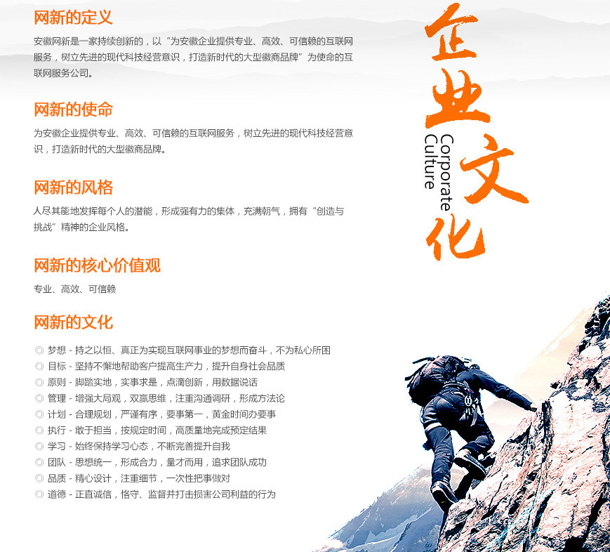 梦想-持之以恒、真正为实现互联网事业的梦想而奋斗,不为私心所困 目标-坚持不懈地帮助客户提高生产力,提升自身社会品质 原则-脚踏实地,实事求是,点滴创新,用数据说话 管理-增强大局观,双赢思维,注重沟通调研,形成方法论 计划-合理规划,严谨有序,要事第一, 黄金时间办要事 执行-敢于担当,按规定时间,高质量地完成预定结果 学习-始终保持学习心态,不断完善提升自我 团队-思想统- - ,形成合力,量才而用,追求团队成功 品质-精心设计,注重细节,一次性把事做对 道德-正直诚信,恪守、监督并打击损害公司利益的行为