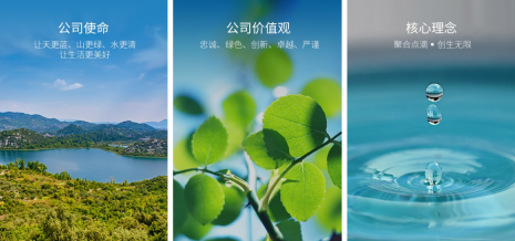 公司使命:让天更臣、山更绿、水更清让生活更美好 公司价值观:思诚、绿色、创新、卓越、严谨 核心理念:紧合点滴· 创生无限