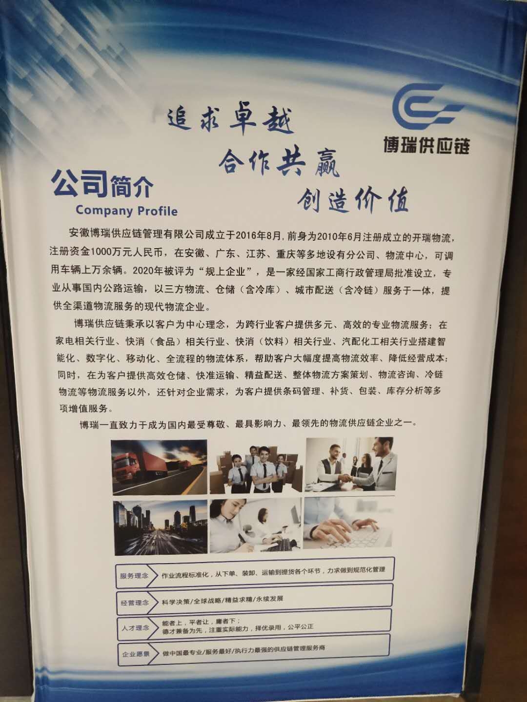 工商登记基本信息 企业名称安徽博瑞供应链管理有限公司 企业法人周菊花 注册资本 万人民币 创立时间2016-08-17 00:00:00 经营状态存续 注册号340100001726580 信用代码91340100MA2MYUEQXG 办公地点临泉路与全椒路交口信地城市广场A座506室 经营范围货物运输代理;普通货物运输;货物装卸,仓储(除危险品);文化艺术交流策划;企业管理咨询及服务;企业形象策划;会务会展服务;办公用品、设备销售及上门维修;食品、生产原材料、日用百货、五金建材、电子产品、通讯器材、家用电器、体育用品销售;国内广告设计、制作、代理、发布;图书批发及零售;工业设备销售及上门维修。(依法须经批准的项目,经相关部门批准后方可开展经营活动)