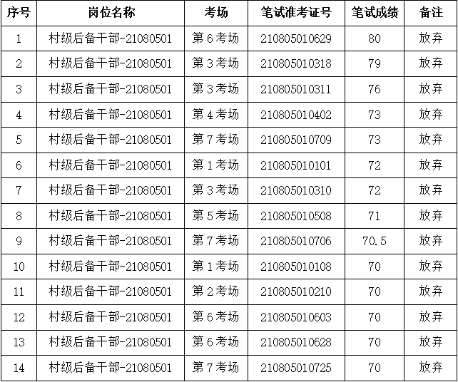 根据《长丰县朱巷镇2021年公开招考村级后备干部公告》(2021-07-23)的规定,资格复审已于2021年9月16日结束,因个人原因自动放弃资格复审,其放弃人员如下: