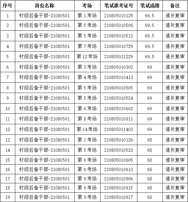 根据《公告》规定,所空名额按笔试成绩从高分到低分依次等额递补一次(最后一名如有多名考生笔试成绩相同的,同分人员均进入下一环节)。故递补复审人员如下:
