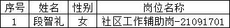 根据《2021年庐阳区四里河街道公开招聘政府购买服务岗位人员公告》(2021-09-17)的招考要求,经过网上报名、资格审核、笔试、面试、体检政审等程序,现将拟聘人员名单公示如下:
