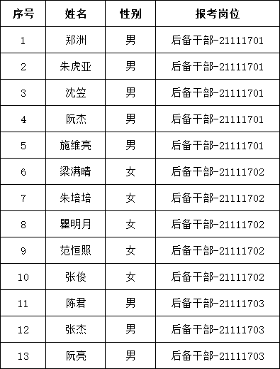 根据《庐阳区三十岗乡2021年村级后备干部选拔公告》(2021-11-23)相关要求,经过现场报名、资格审核、笔试、面试、体检政审等程序,现将拟聘人员名单公示如下: