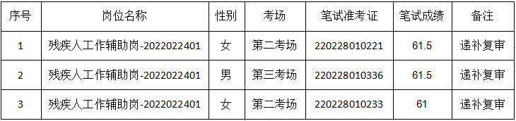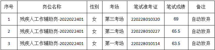 根据《庐阳区残疾人联合会2022年公开招聘政府购买服务岗位人员公告》(2022-2-21)的招考要求,资格复审已于2022年3月11日16:00结束,以下3名考生因个人原因自动放弃资格复审,其放弃人员如下: