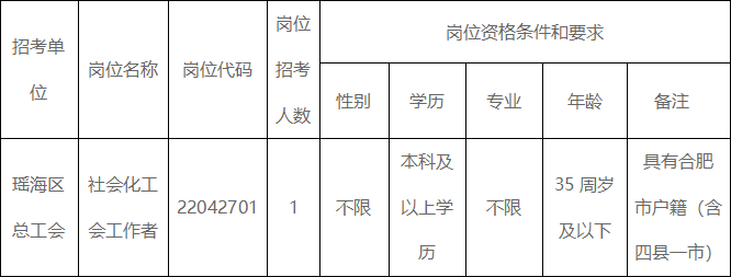 结合实际工作需要,经研究决定,瑶海区总工会2022年面向合肥市公开招聘社会化工会工作者1名,现将有关事项公告如下: