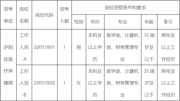 结合实际工作需要,经研究决定,庐阳区医疗保障局2022年面向社会公开招聘政府购买服务岗位工作人员2名,现将有关事项公告如下: