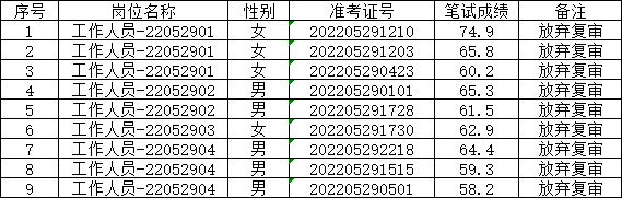 根据《肥西县花岗镇2022年公开招考村级后备干部公告》(2022-05-28)的招考要求,资格复审已于2022年6月16日16:00结束,以下9名考生因个人原因自动放弃资格复审,其放弃人员如下: