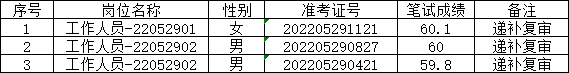 根据《公告》规定,所空名额按笔试成绩从高分到低分依次等额递补一次。若出现笔试成绩并列,同分人员均进入递补复审环节。故递补人员如下: