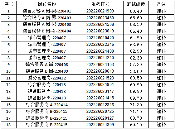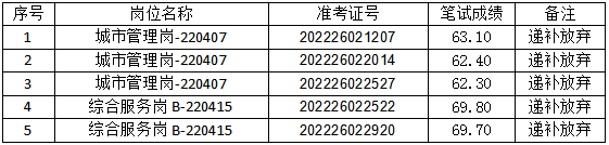 根据《公告》规定,所空名额按笔试成绩从高分到低分依次等额递补(若出现笔试成绩并列,同时入围资格复审人员名单),因以下考生递补放弃
