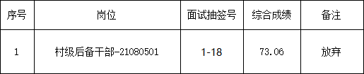 根据《长丰县朱巷镇2021年公开招考村级后备干部公告》(2021-07-23)的规定,经过报名、资格初审、笔试、资格审核、面试、体检、政审等程序,由于以下1名考生自愿放弃