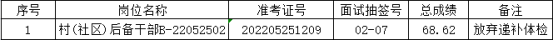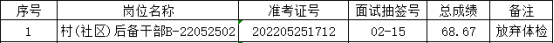 根据《长丰县下塘镇2022年公开选拔村(社区)后备干部公告》(2022-05-18)的规定,经过报名、资格初审、笔试、资格审核、面试、体检等程序,由于以下1名考生放弃体检。