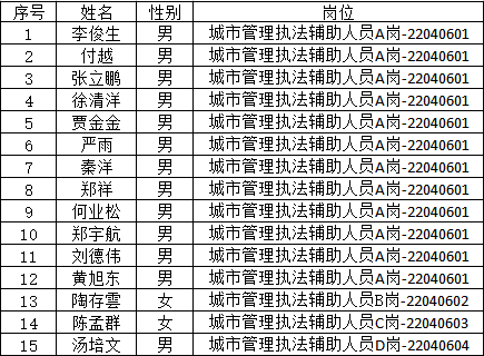 根据《长丰县双凤经济开发区2022年招聘城市管理执法辅助人员公告》(2022-04-01)相关要求,经过网上报名、资格初审、笔试、体能测试、资格复审、面试、体检、政审等程序,现将拟聘人员名单公示如下。