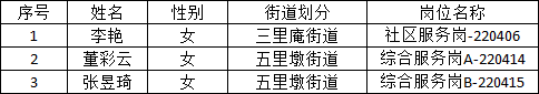 根据《合肥市蜀山区2022年政府购买服务岗位招聘公告》(2022-04-02)的规定,经过报名、资格初审、笔试、资格审核、面试、体检、递补等程序,现将拟聘人员名单公示如下: