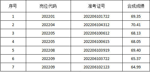 根据《肥西县上派镇2022年公开招聘城市社区工作者公告》规定,因202201岗位、202204岗位、202205岗位、202208岗位、202209岗位共有7名考生放弃体检,在同岗位面试考生中依据考试最终成绩按1:1的比例从高分到低分等额递补(若最后一名出现合成成绩并列的,以面试成绩高者优先)。现将递补体检人员名单及有关事项公告如下