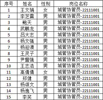 根据《长丰县下塘镇综合执法队2022年公开招聘城市协管员25人公告》(2022-11-03)相关要求,经过网上报名、资格初审、笔试、资格复审、面试、体检政审等程序,现将拟聘人员名单公示如下: