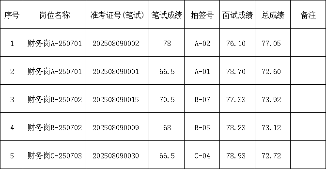 根据《合肥新亚新兴能源有限公司招聘5名财务人员》(2025-07-23)公告规定,经过网上报名、笔试、资格复审、面试等程序,现将面试成绩、总成绩及进入体检、考察程序的初选人员名单及相关事宜通知如下: