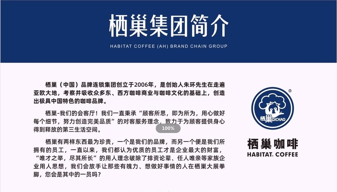 栖巢(中国)品牌连锁集团创立于2006年,是创始人朱环先生在走遍亚欧大地,考察并吸收众多东、西方咖啡商业与咖啡文化的基础上,创造出极具中国特色的咖啡品牌。